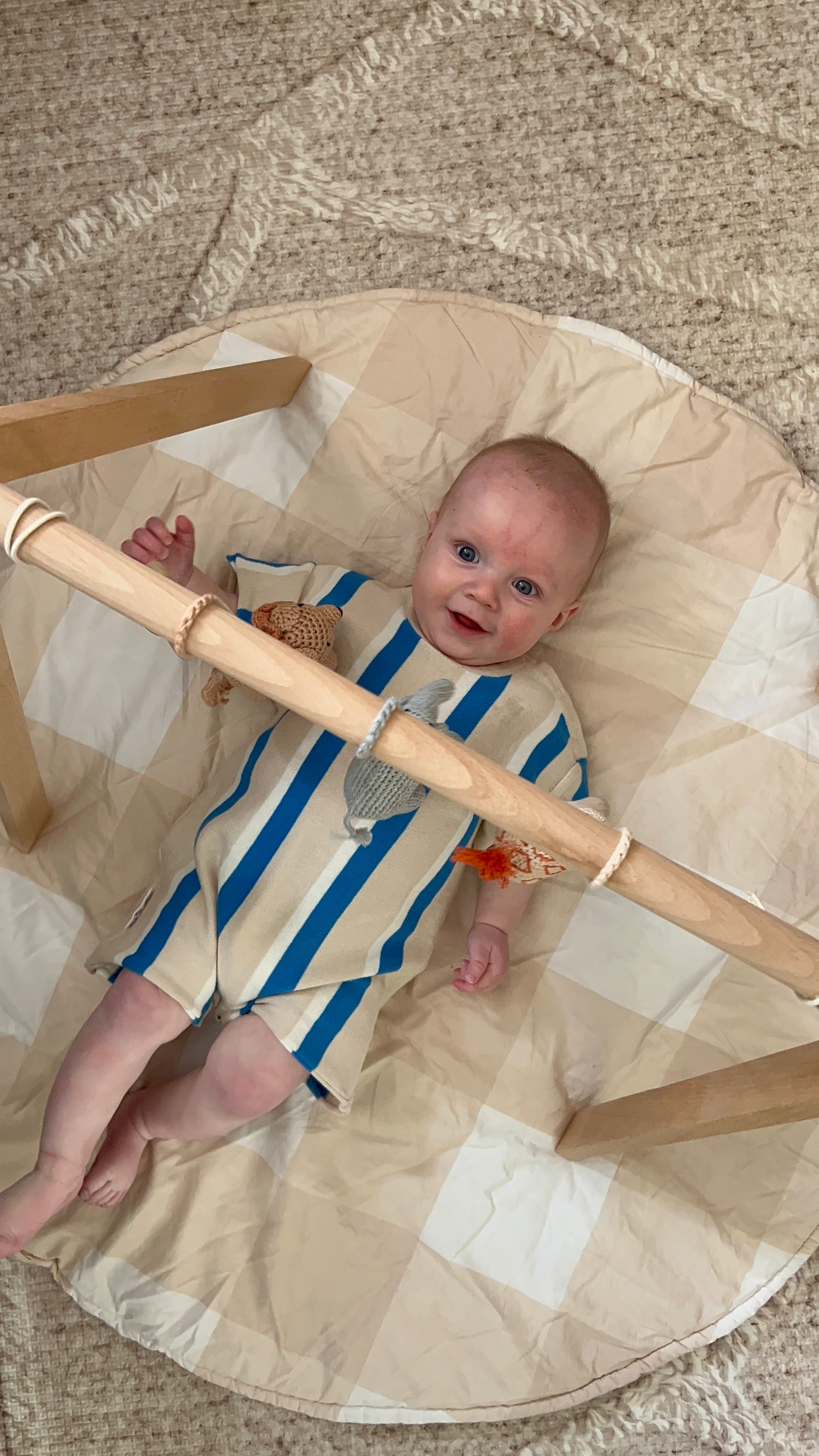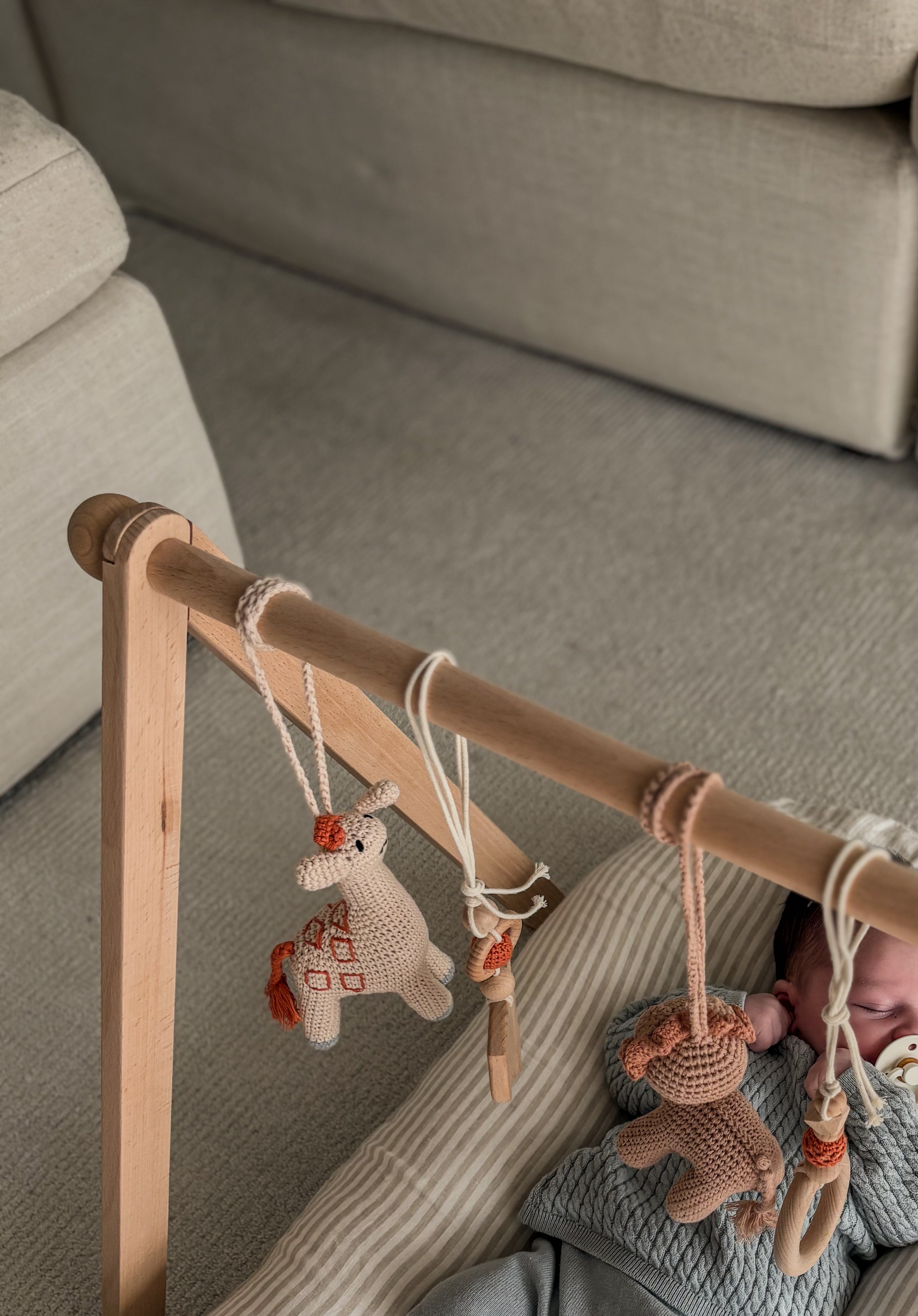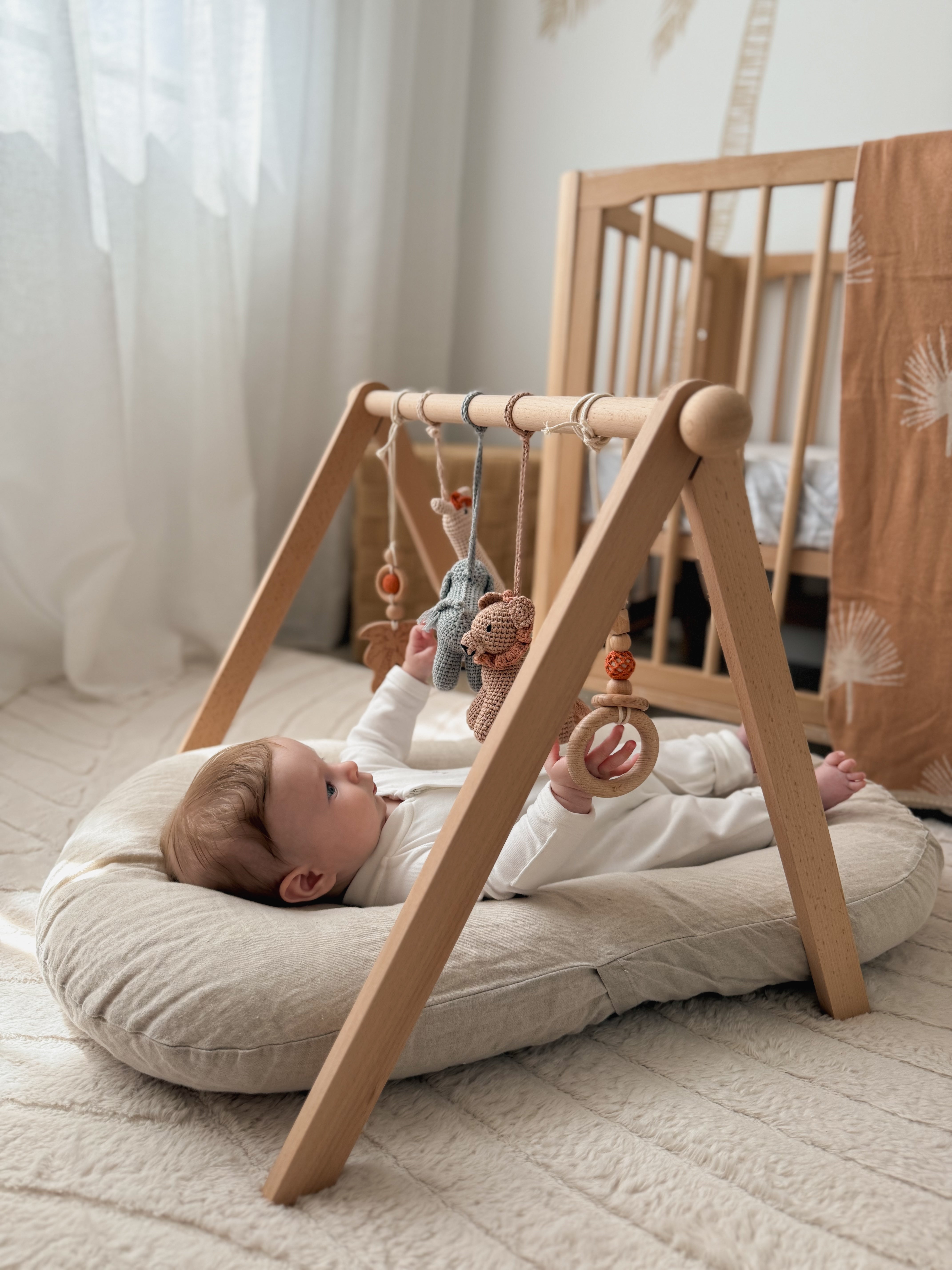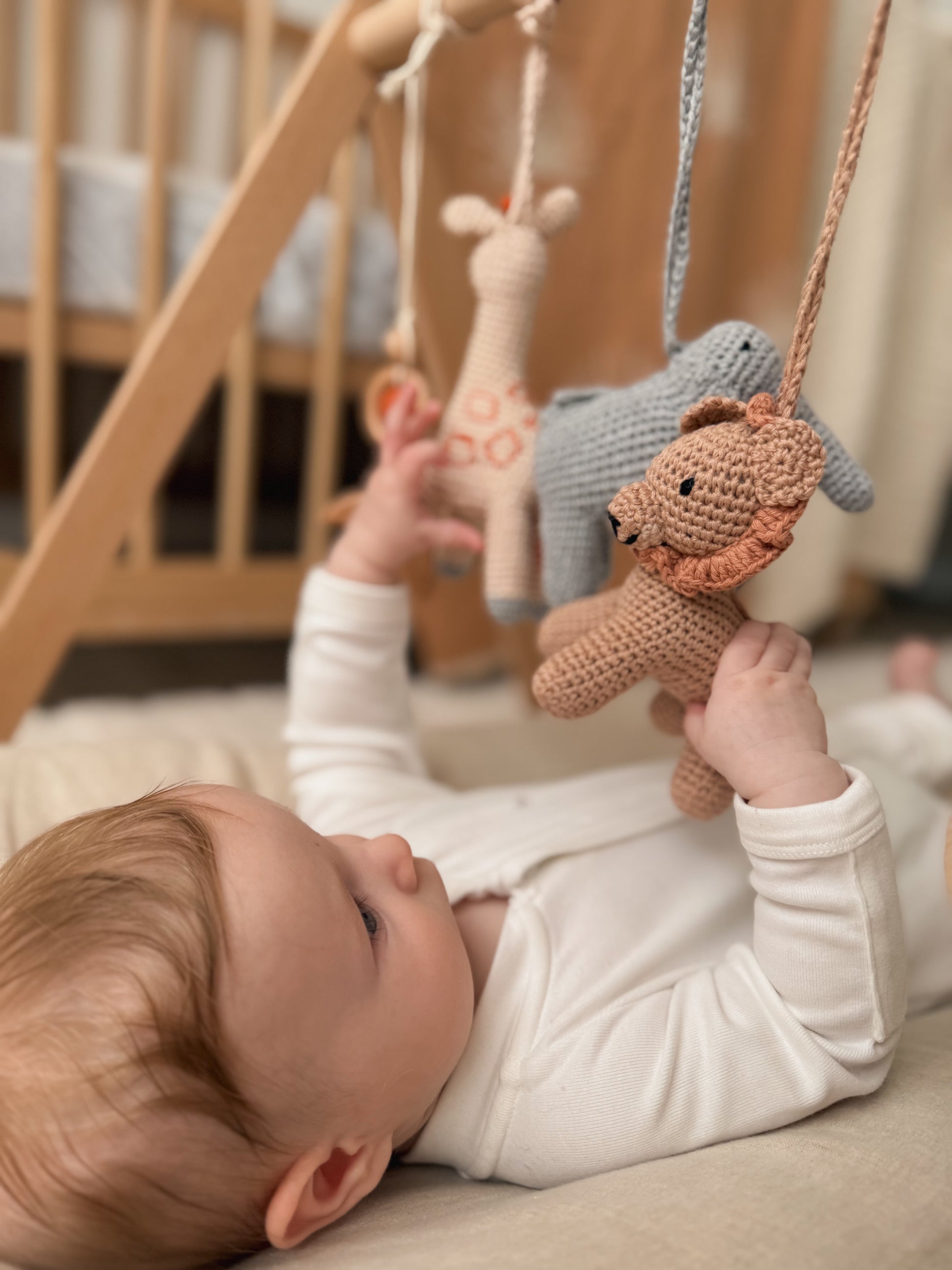 Our safari themed baby play gym features hand made crochet animal rattles providing your baby with the opportunity to be immersed in play and build their fine motor skills.